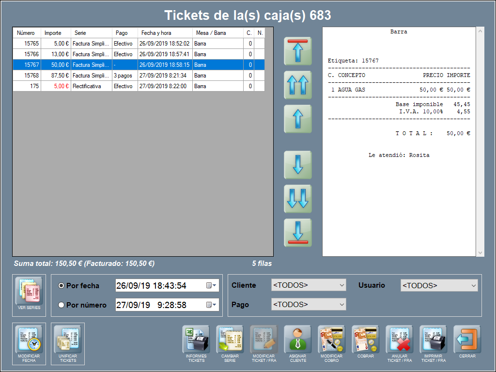 Por otro lado, es bueno que conozcas las funcionalidades de cada botón, ya que tienes muchas acciones disponibles, como: modificar la fecha de un ticket, realizar una factura agrupando varios ticket, realizar el cobro de un ticket pendiente, anular un ticket, y otras cosas.