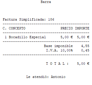 La Factura Simplificada 186 es de 5,00 € y ha quedado pendiente de cobro. Si te fijas no existe ninguna línea en la que ponga ‘Forma de pago: xXxXx’.