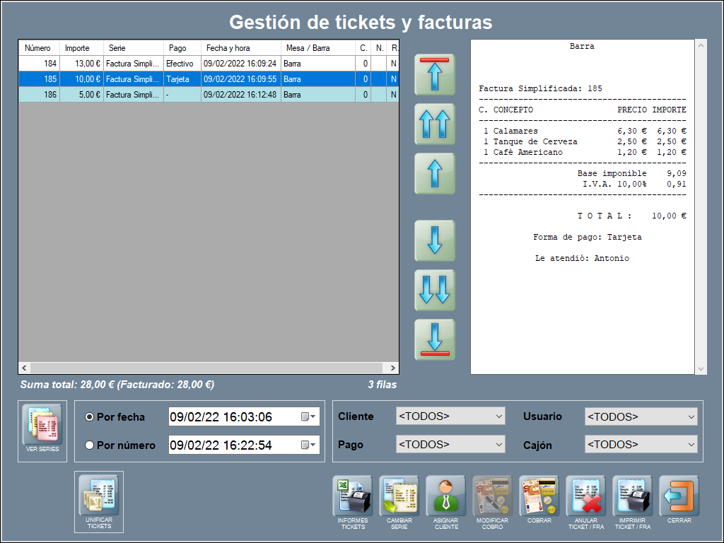 Los filtros por serie, fecha, número, cliente, pago y usuario, no necesitan explicación, dado su sencillez. En cada opción utiliza el desplegable (cliente, usuario y pago); rellena el recuadro (para fechas y número de ticket) o marca la que quieras. Es muy intuitivo. Además, si tienes más de un ID caja, aparece un filtro por cajón.