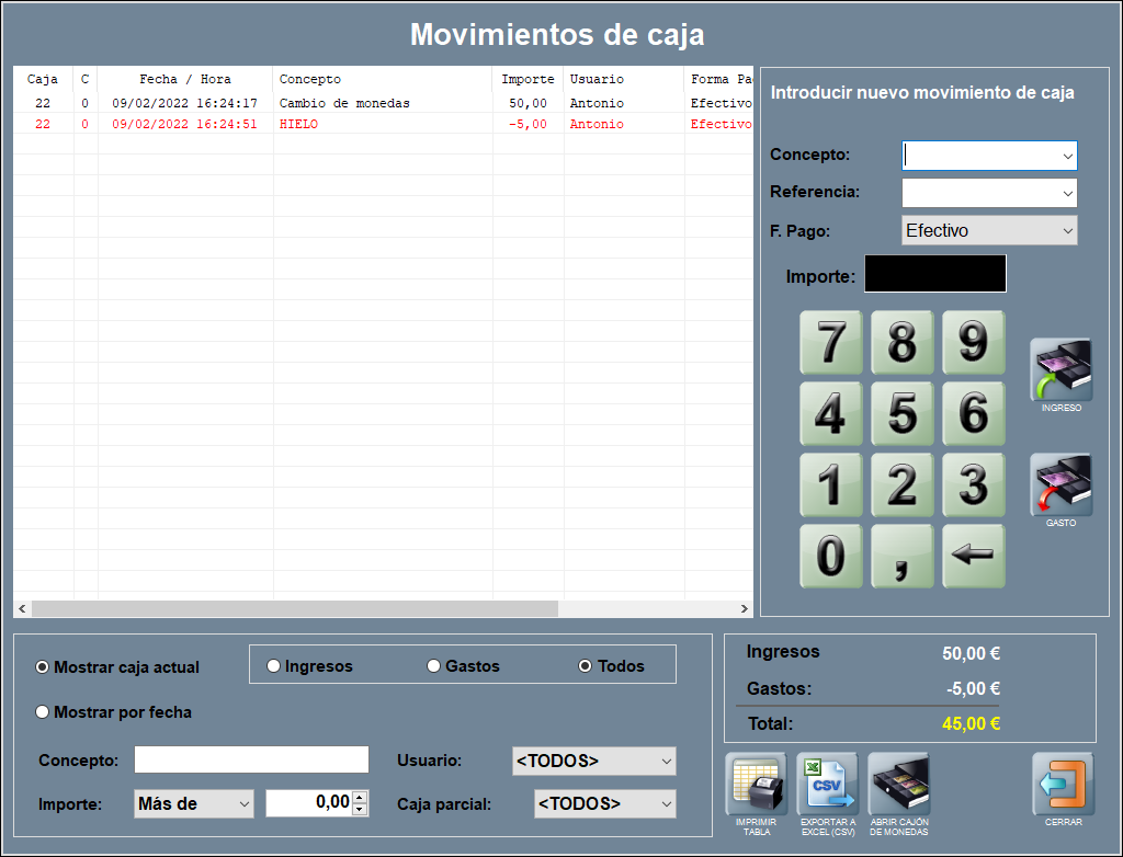 Además, se realizan movimientos de dinero que añaden efectivo al cajón (como un cambio de monedas que añade 50,00 €). O movimientos de dinero que sacan dinero del cajón (como un pago al proveedor de hielo de 5,00 €).
