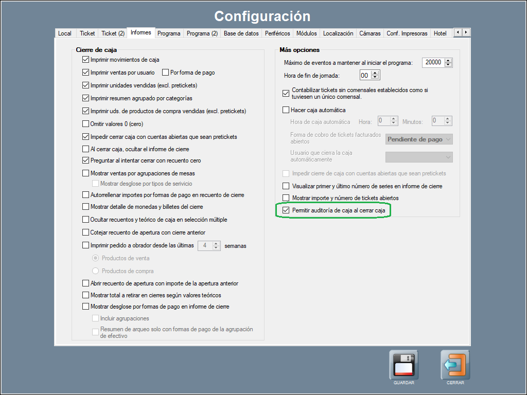 Puedes imprimir la Auditoría de caja al cerrar caja al activar la opción Permitir auditoría de caja al cerrar caja desde Panel de Gestión / Configurar Opciones / Informes / Más Opciones.