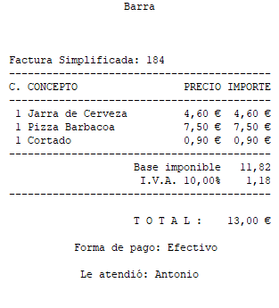 La Factura Simplificada 184 asciende a un total de 13,00 € y se ha cobrado con la forma de pago efectivo.