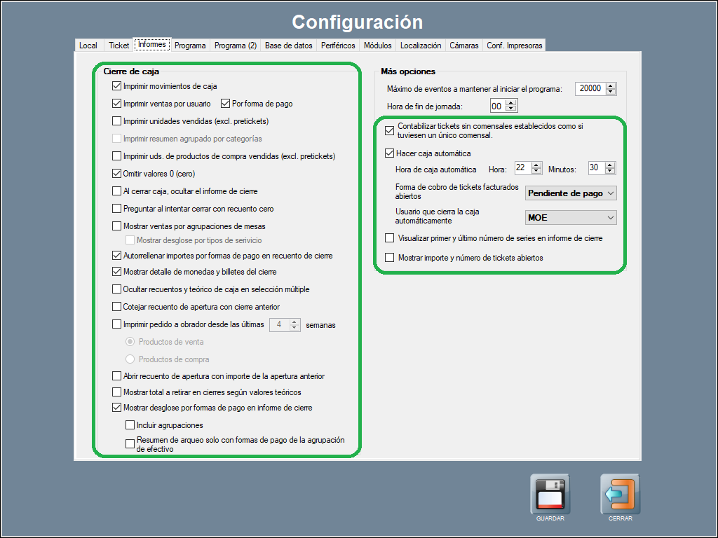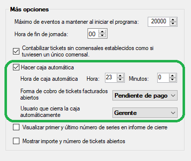 A destacar la configuración específica para activar el cierre automático. Se puede configurar una hora en la que si hay cajas abiertas se haga automáticamente un cierre de éstas, por un usuario definido, siempre que no esté en pantallas de configuración del progama, gestión de productos o similar.
