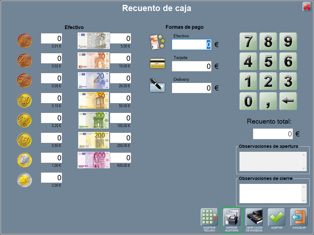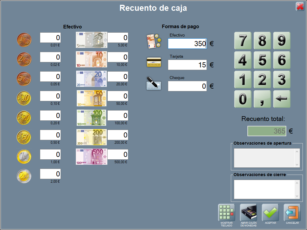 Tras seleccionar el tipo de recuento, modifica en pantalla el total para billetes y monedas dónde corresponda y ACEPTAR. A destacar, que puedes tener acceso a la apertura de cajón o al teclado en pantalla para escribir observaciones, si quieres.