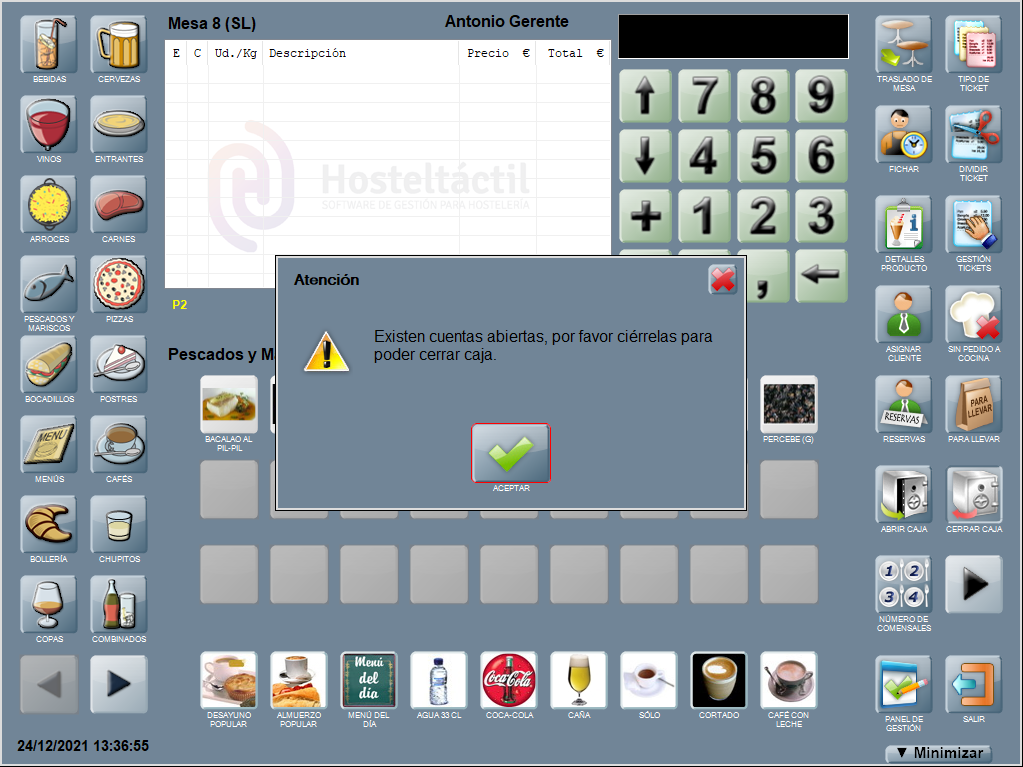 Al intentar cerrar caja con cuentas abiertas sale un aviso.