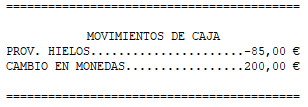 Imprimir movimientos de caja: imprime las entradas y salidas de dinero, estas últimas en negativo.