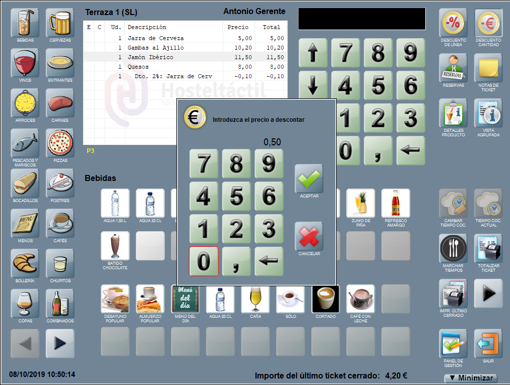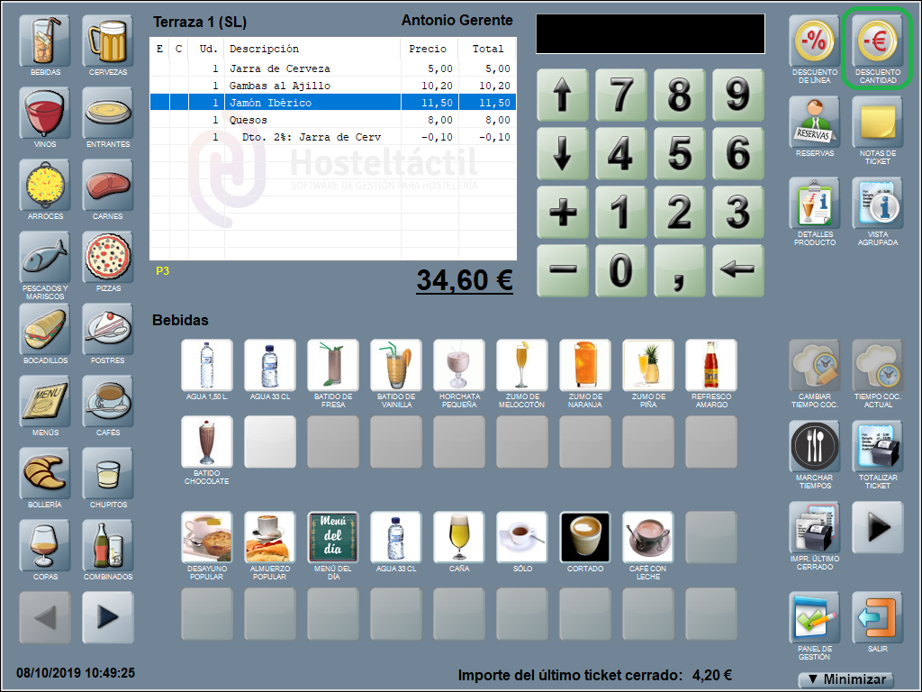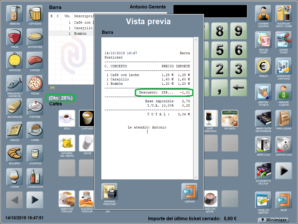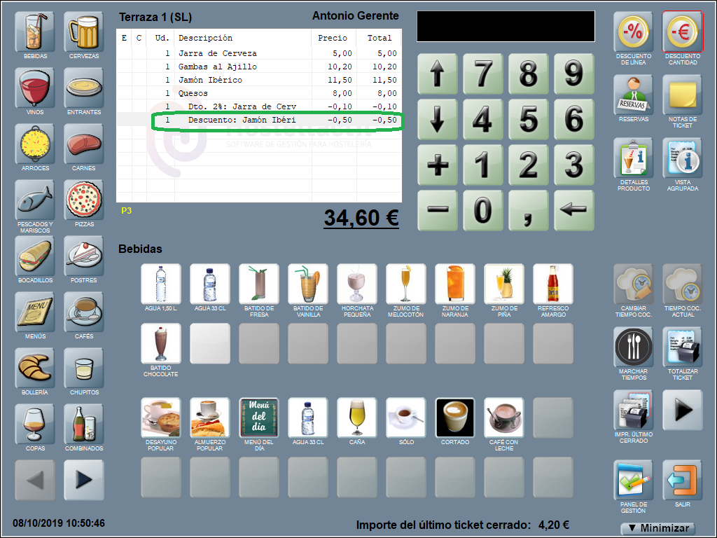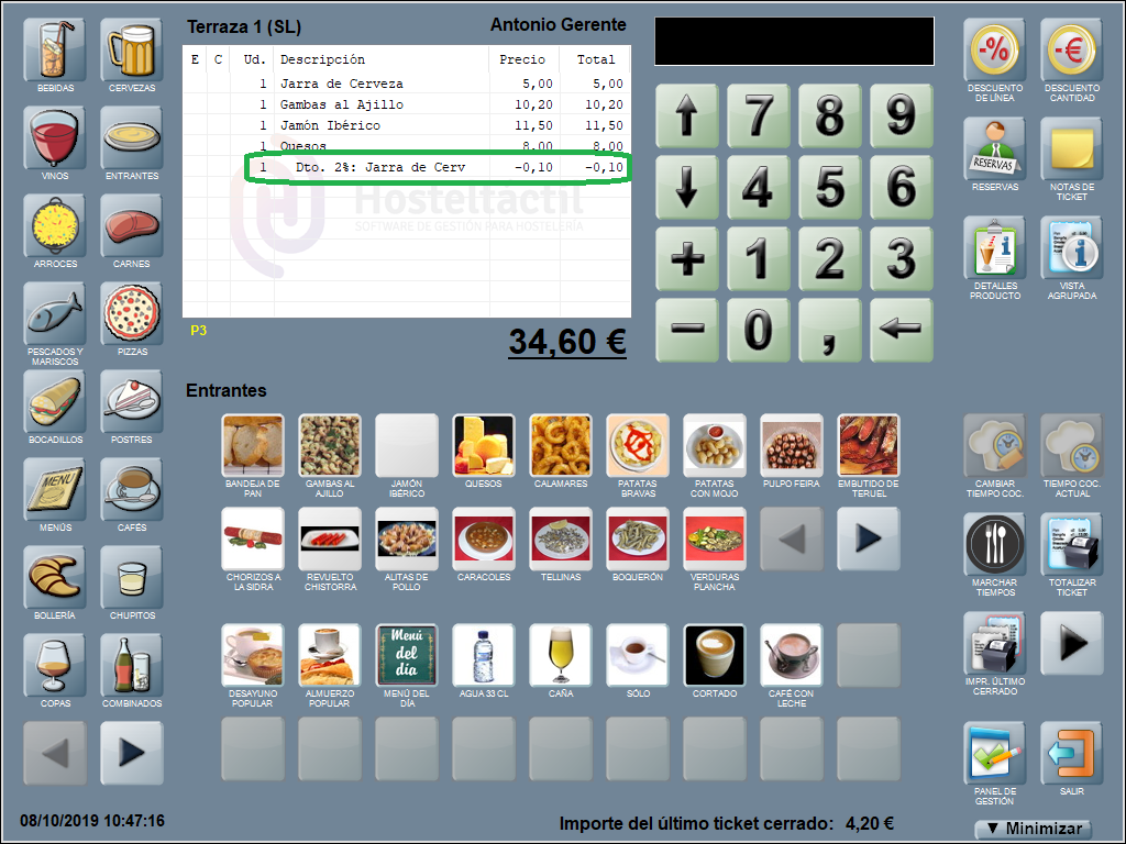 Se añade una línea en la ventana de ticket con el descuento aplicado, el nombre del producto al que corresponde y el equivalente en euros (en negativo, indicando que se restará al total de la suma de las líneas que componen la comanda). En el ejemplo: Dto. 2%: Jarra de Cerveza (-0,10).