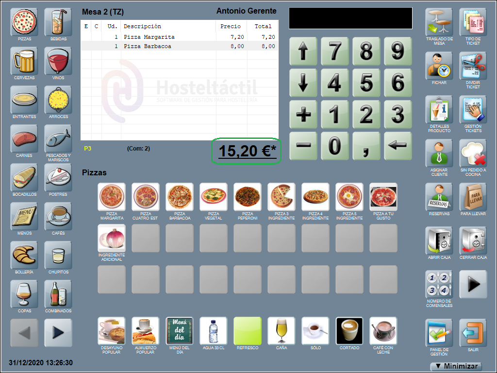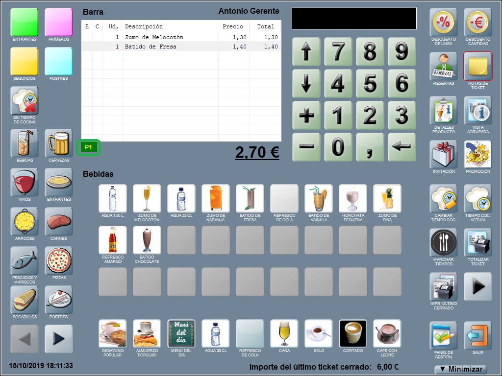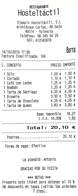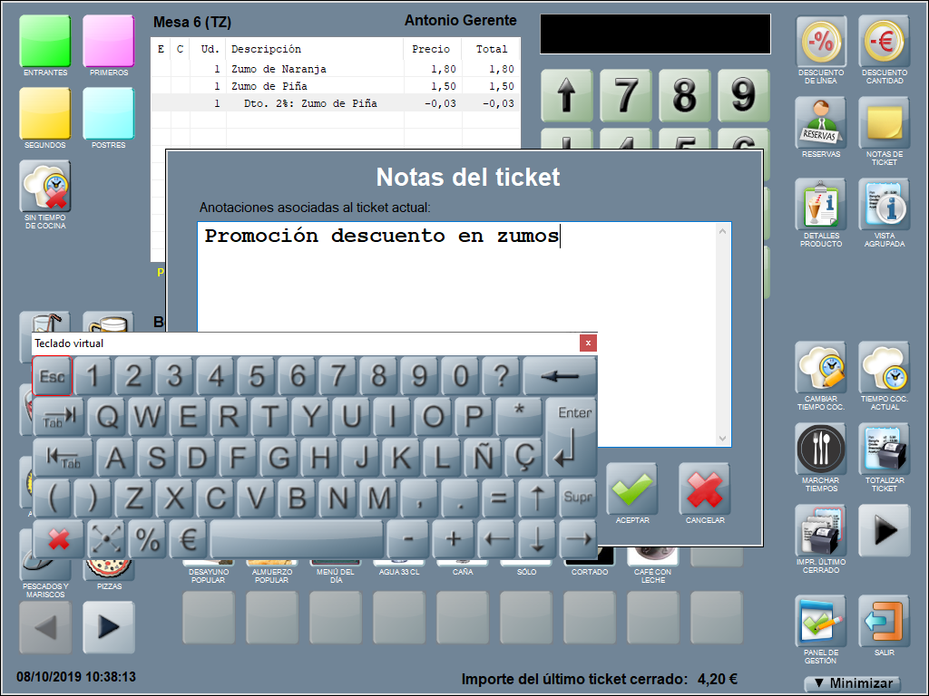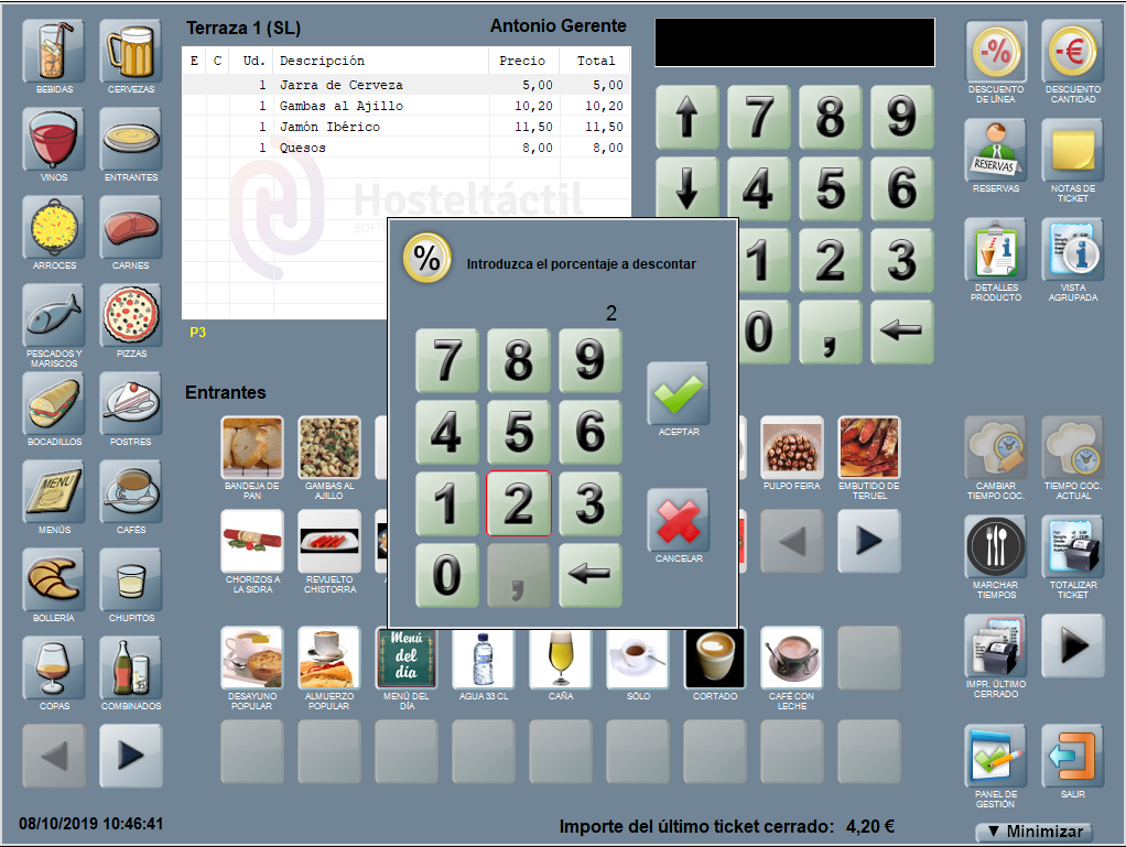 Se añade una línea en la ventana de ticket con el descuento aplicado, el nombre del producto al que corresponde y el equivalente en euros (en negativo, indicando que se restará al total de la suma de las líneas que componen la comanda). En el ejemplo: Dto. 2%: Jarra de Cerveza (-0,10).