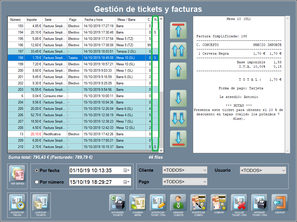 Desde la ventana de Gestión de tickets y facturas, también puedes saber qué tickets llevan nota añadida, puesto que en la columna con el encabezado N (nota), aparecen con la letra S.