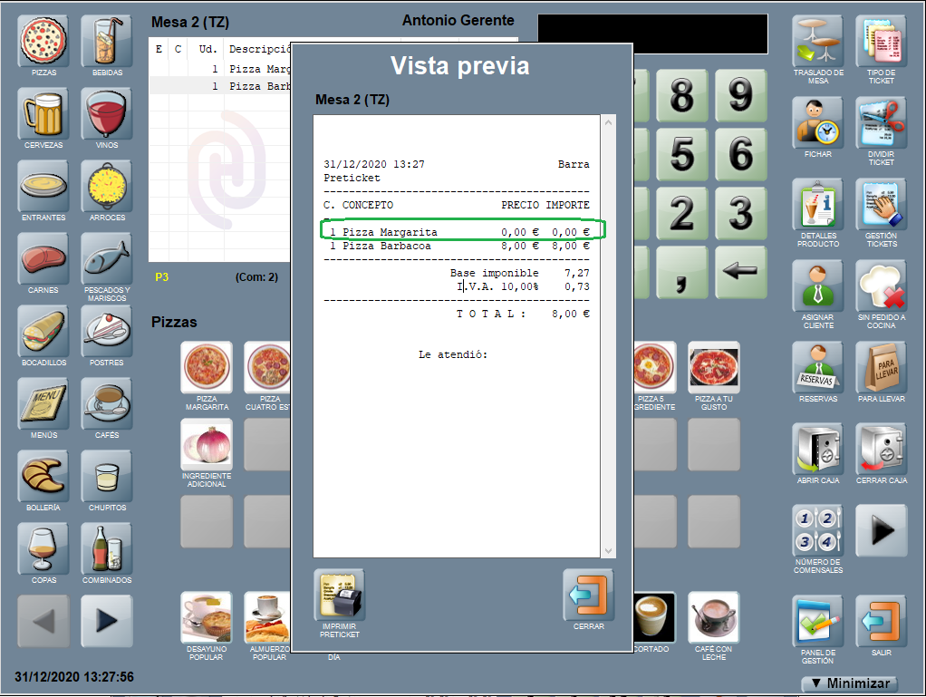 Tanto en la vista previa del ticket como en el ticket impreso se aplica la promoción productos gratis mostrando el producto regalado a precio = 0,00 € (el de mayor o menor precio, según la configuración de la promoción).