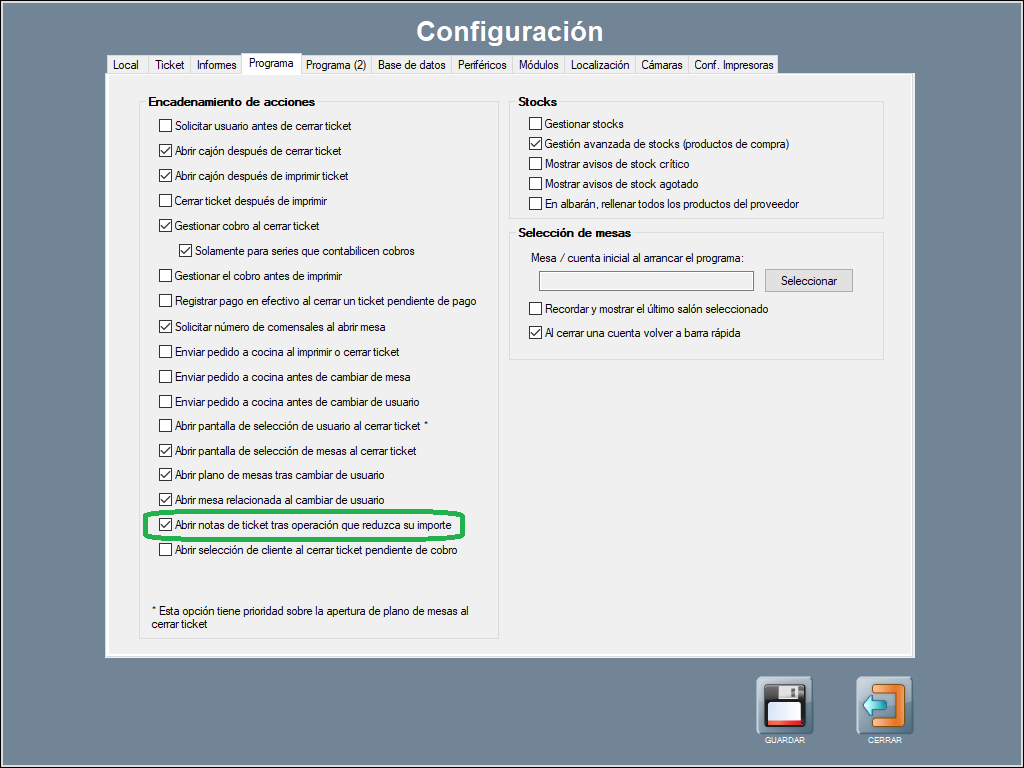 La primera configuración, que puedes encontrar en la pestaña Programa, del Panel de gestión / Configuración / Configurar opciones, permite abrir notas de ticket de forma automática tras operaciones que reduzcan su importe (descuentos, anulaciones, cambios de precio, etcétera).