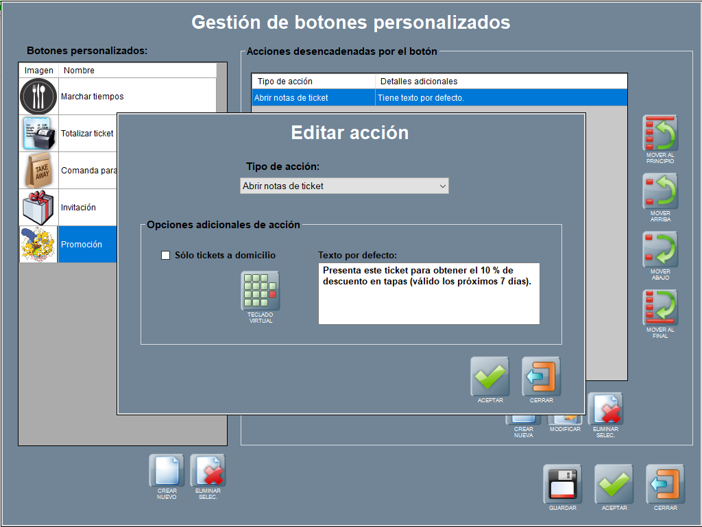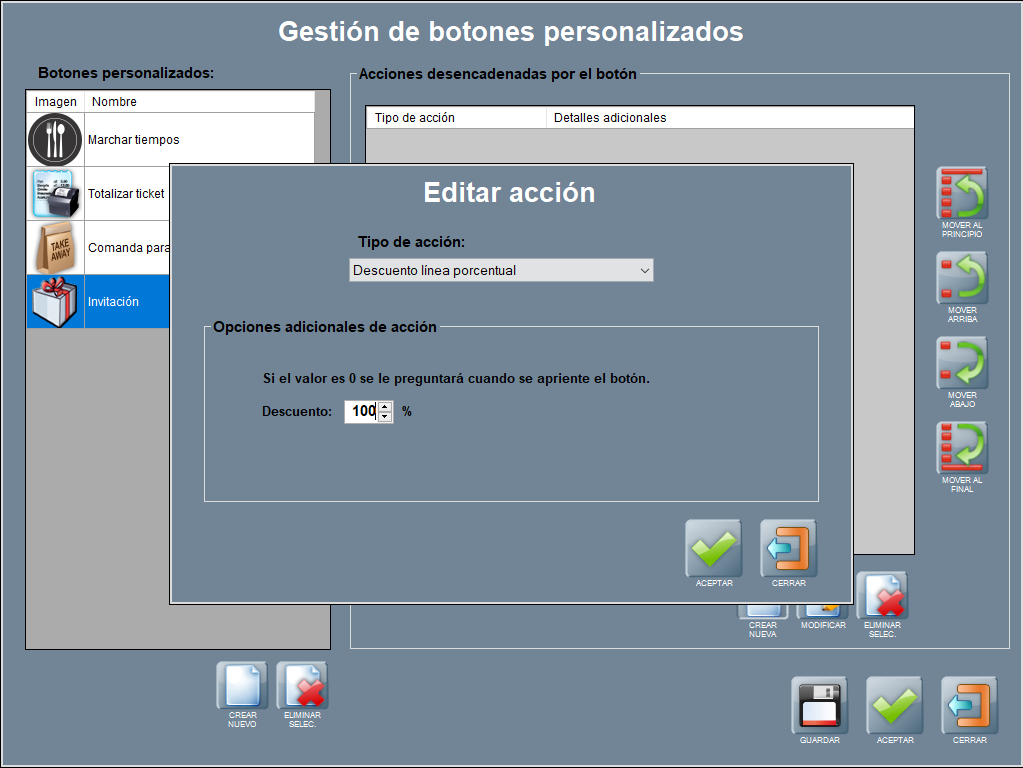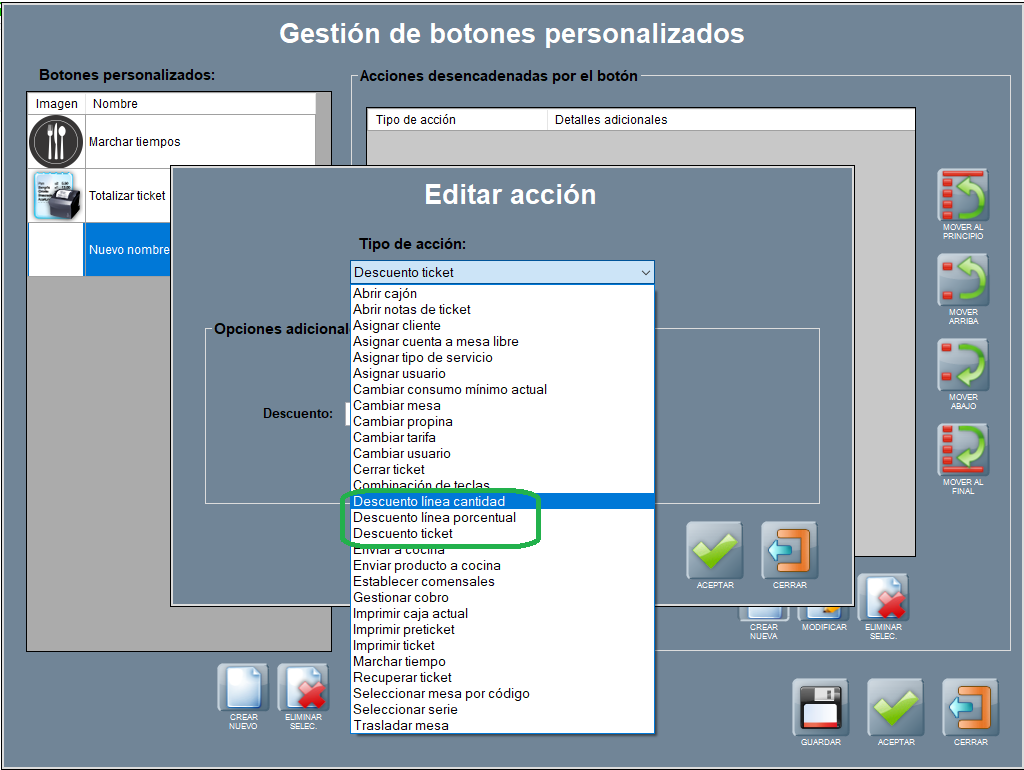 En este apartado sólo indicarte que mediante los botones personalizados puedes realizar una serie de acciones relacionadas con descuentos, que ya hemos explicado en esta página: cómo los descuentos porcentuales y los descuentos ticket, así cómo los descuentos línea de cantidades fijas (en euros).