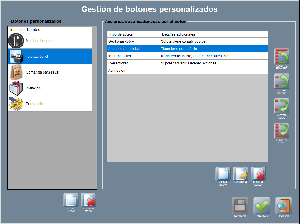 O también puedes encadenar la acción de abrir notas de ticket y un texto por defecto, con la gestión del cobro, la impresión del ticket, el cierre de ticket y la apertura de cajón. Y usar sólo un botón para todas las acciones juntas.