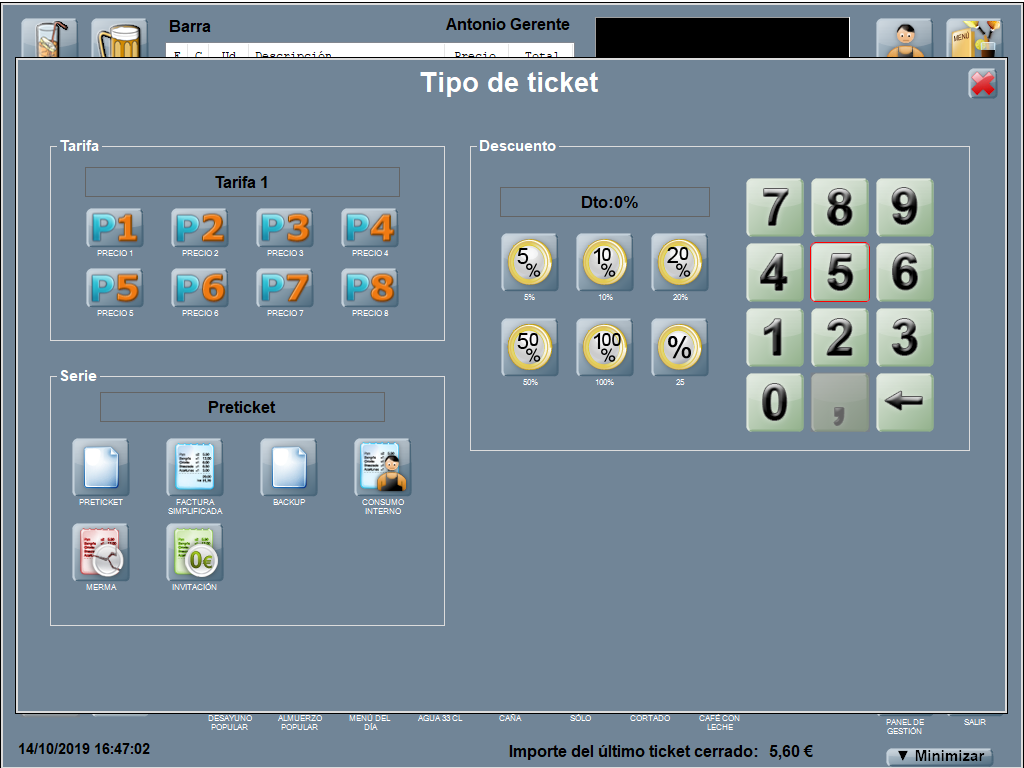 Se abre la ventana Tipo de ticket, dónde dispones de una serie de descuestos predefinidos (5%, 10%, 20%, 50% y 100%). Si el descuento que deseas aplicar no está entre los disponibles, escríbelo con el teclado en pantalla y pulsa %, para aplicarlo al ticket.
