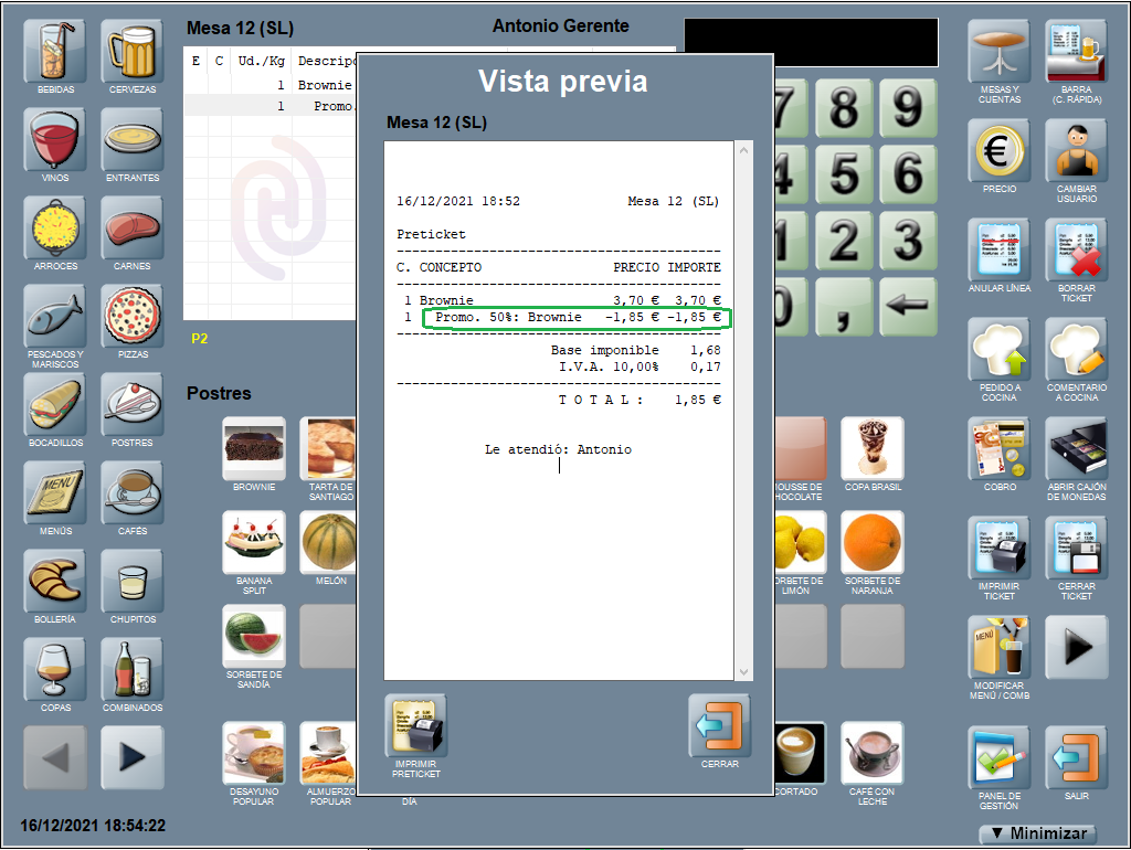 Si se aplica una promoción de productos con descuento, se muestra una línea con el detalle del porcentaje aplicado y el importe (en €) del descuento, tanto en la pantalla principal de interfaz, en la vista previa del ticket como en el ticket impreso.