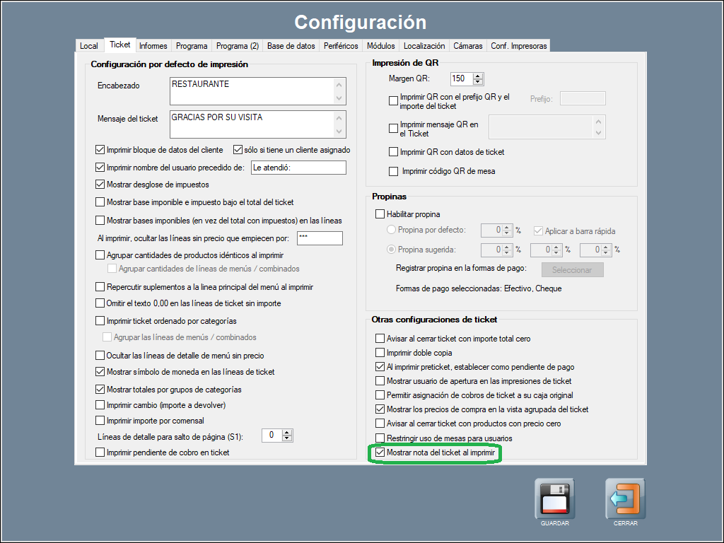 La segunda configuración, ya que la impresión de la nota de ticket es opcional, hace que se imprima o no el texto de la anotación en el ticket. Por lo que si quieres que se imprima, deberás indicar mostrar nota del ticket al imprimir en el apartado Otras configuraciones de ticket de la pesaña Ticket, en Panel de gestión / Configuración / Configurar opciones.