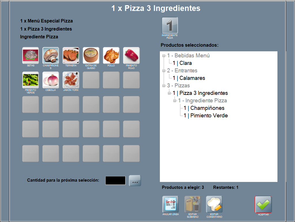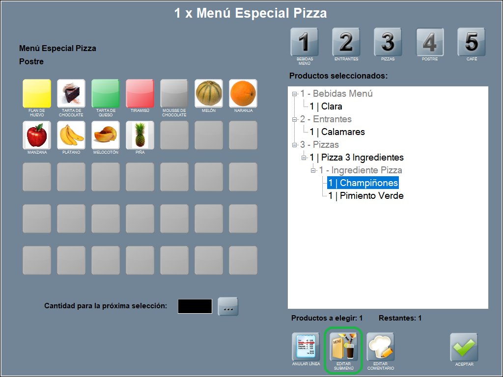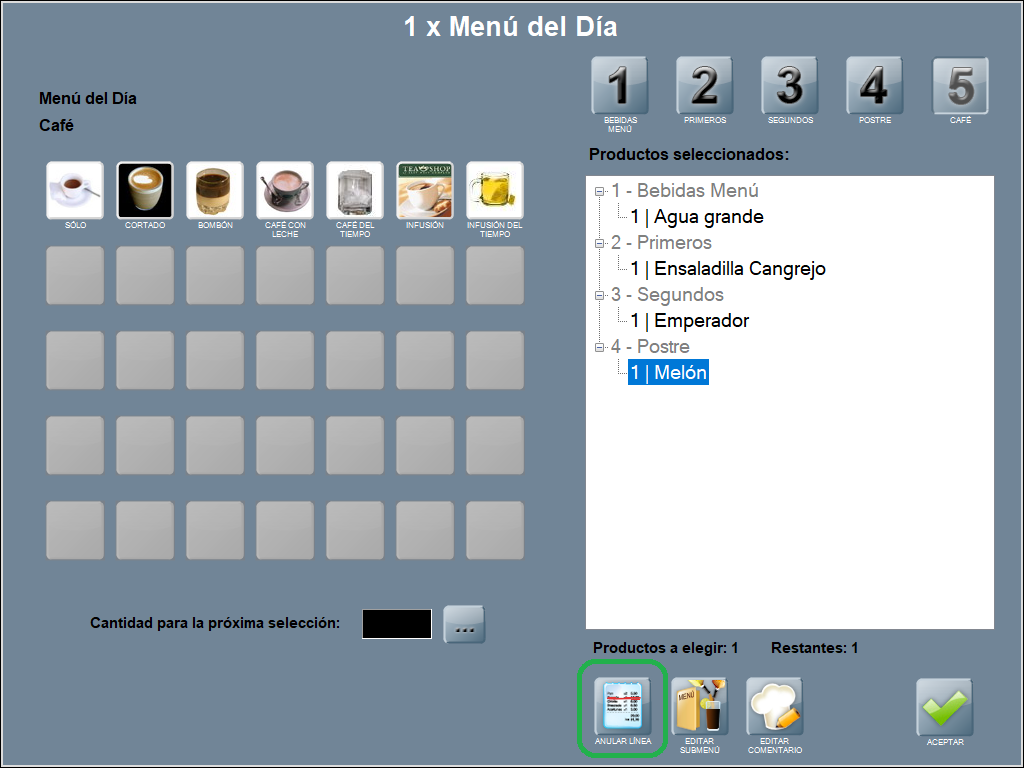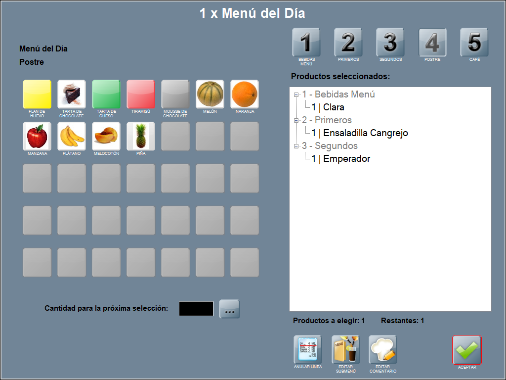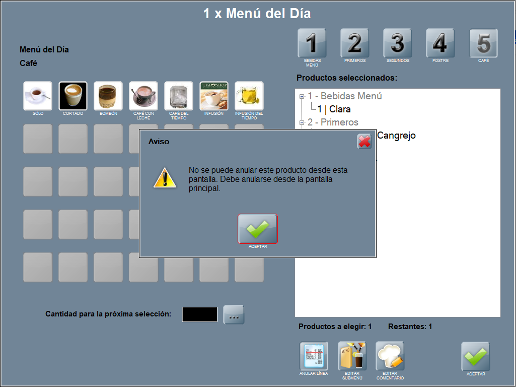 Se abre la ventana de selección de productos para submenú. Puedes realizar las modificaciones que requieras (anular línea, añadir producto, modificar comentarios) y ACEPTAR, para continuar completando el menú normal.