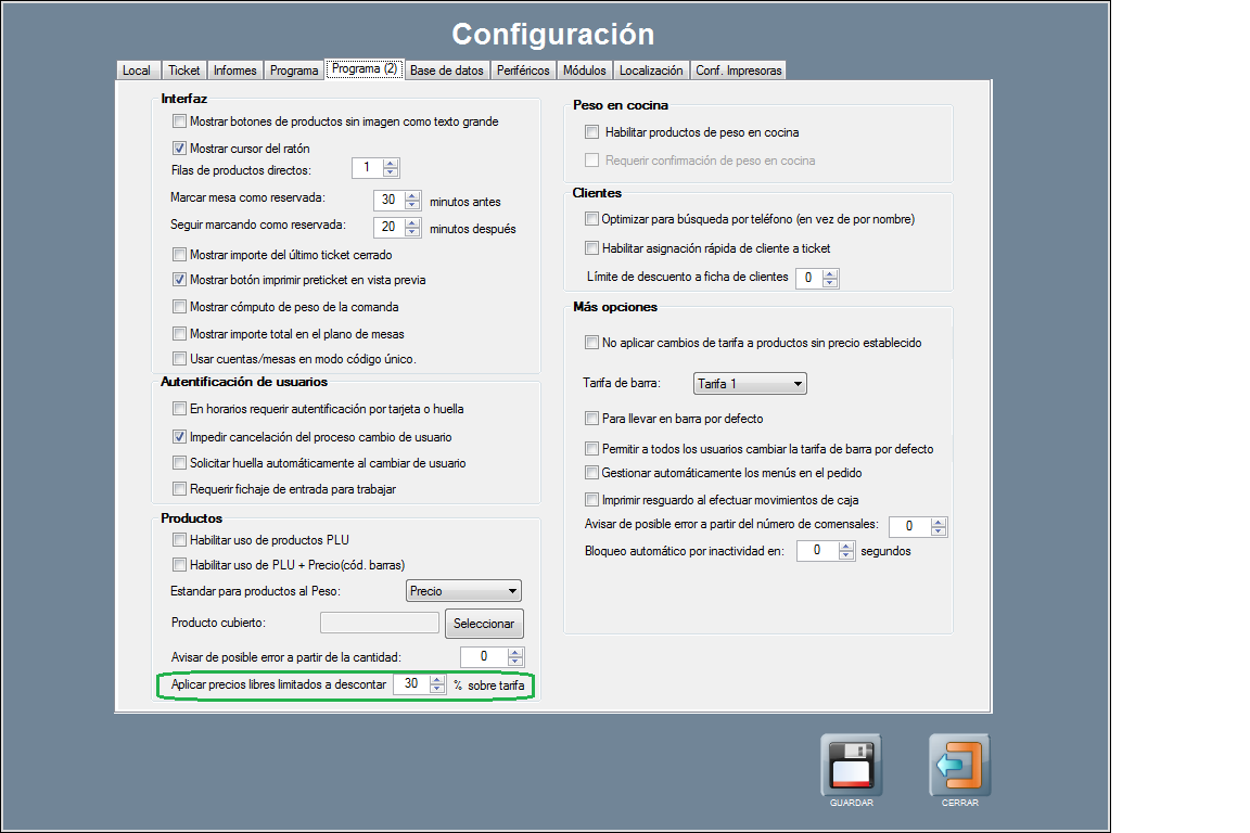 Además, es posible limitar el precio libre a un descuento máximo configurado. Para ello dirígete a Panel de Gestión / Configurar Opciones / Programa(2), en el apartado Productos está la opción: ‘Aplicar precios libres limitados a descontar x % sobre tarifa’.