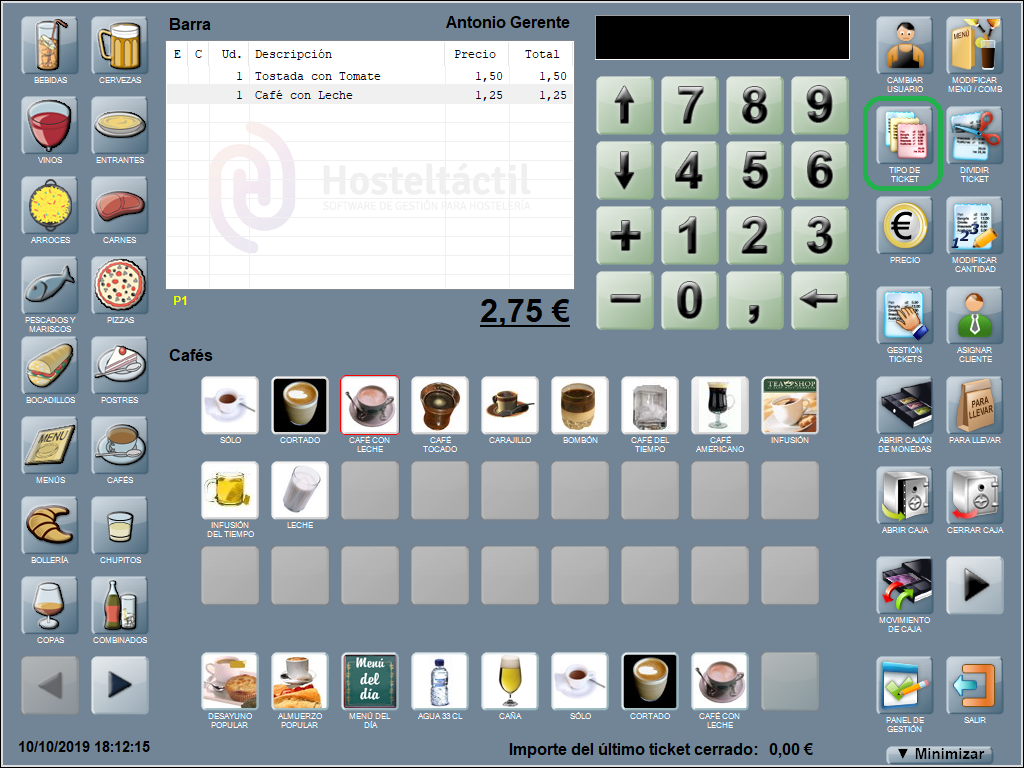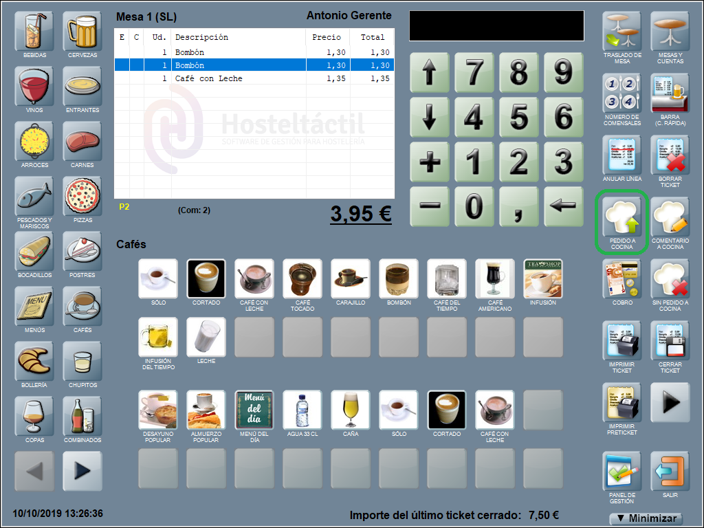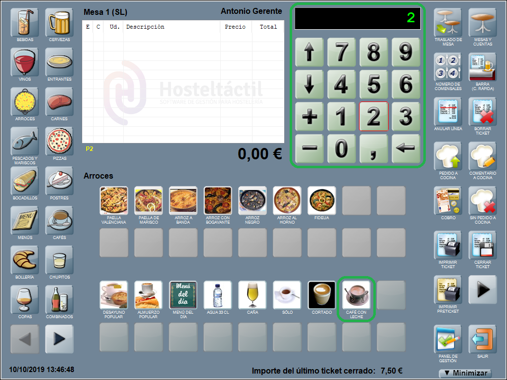 Por ejemplo. Si quieres comandar 2 cafés con leche, escribe un 2 (con el teclado en pantalla) y, a continuación, pulsa sobre el producto ‘café con leche’.