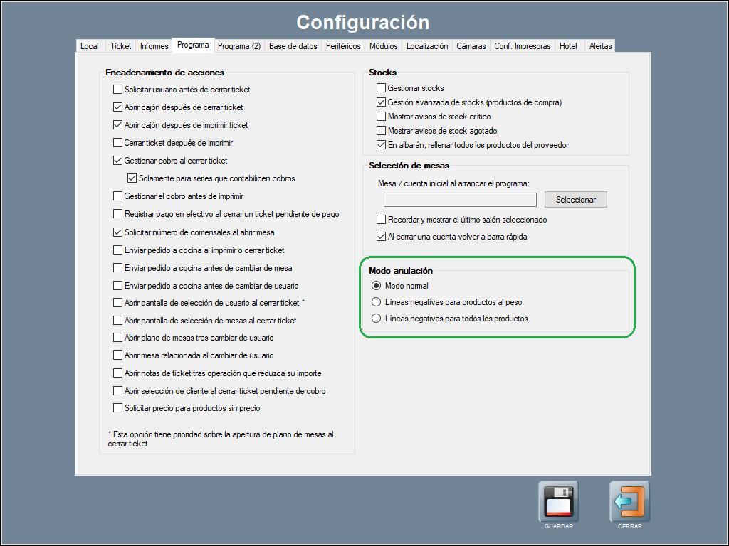 Para activar el Modo anulación en Hosteltáctil®, dirígete a Panel de Gestión / Configurar Opciones / Programa, apartado Modo anulación.