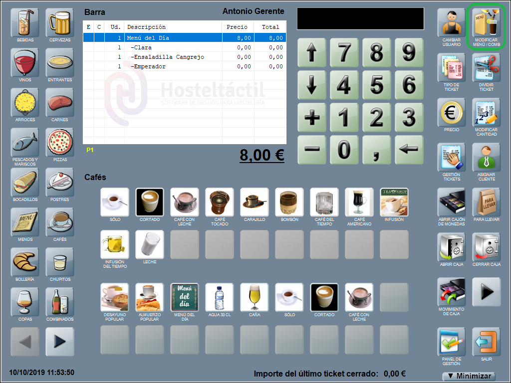 Para modificar un menú o combinado sitúate sobre su línea o sobre la línea de alguno de los productos que lo componen y pulsa MODIFICAR MENÚ / COMBINADO.