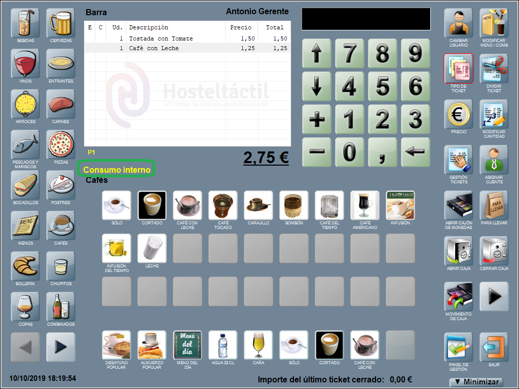 La nueva serie aparece resaltada en la ventana de ticket con letras de color amarillo (en el ejemplo de abajo: consumo interno). Así se destaca visualmente en la pantalla principal la serie asignada al ticket, cuando es distinta a preticket (la que se usa para tickets abiertos).