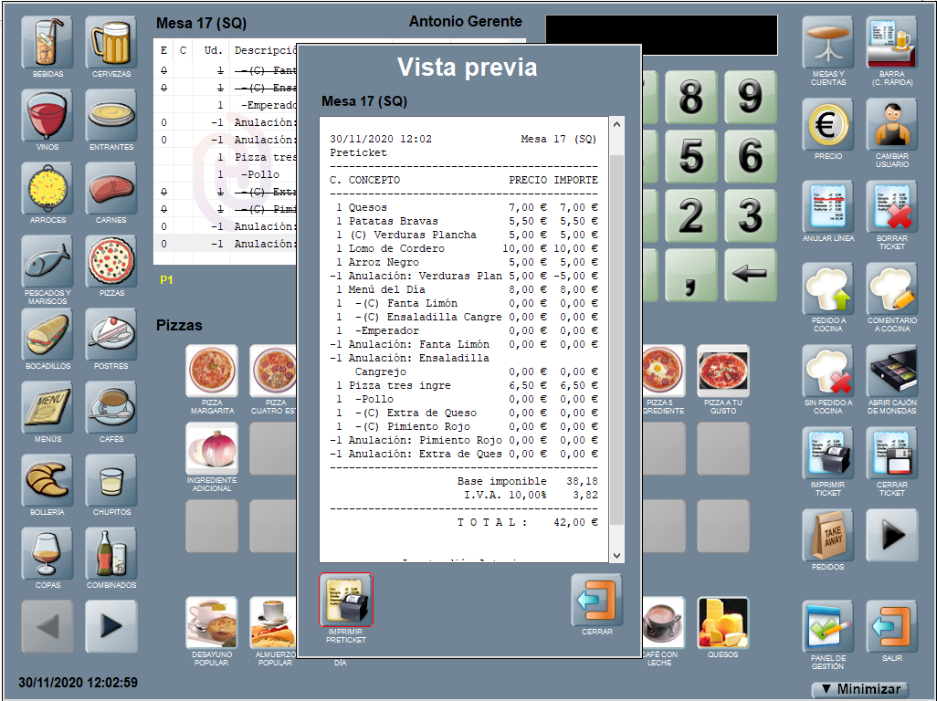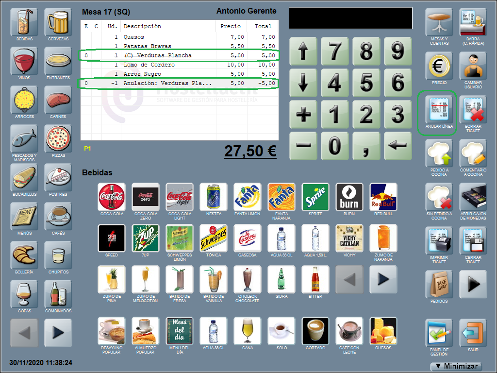 En esta sección, te contamos cómo realizar modificaciones a las líneas ya añadidas en una cuenta para diferentes acciones como: anular una línea determinada o todas las que componen la cuenta, modificar el precio de un producto para que sea diferente al de la carta, modificar la cantidad introducida para un producto, realizar la modificación de los productos que componen un menú, etcétera.