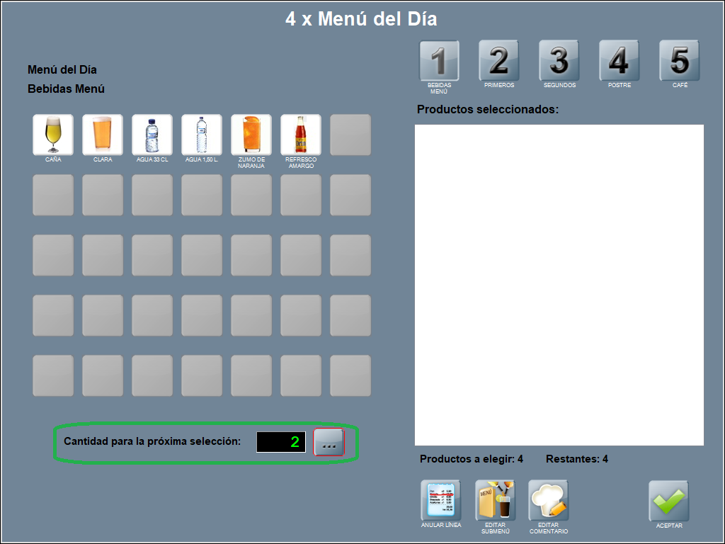 Esto permite que, cómo en el ejemplo, si añadimos 4 ‘menús del día’, y tenemos que comandar 2 ‘aguas’, puedes hacerlo directamente para 2 unidades, sin tener que pulsar el producto ‘agua’ en dos ocasiones.