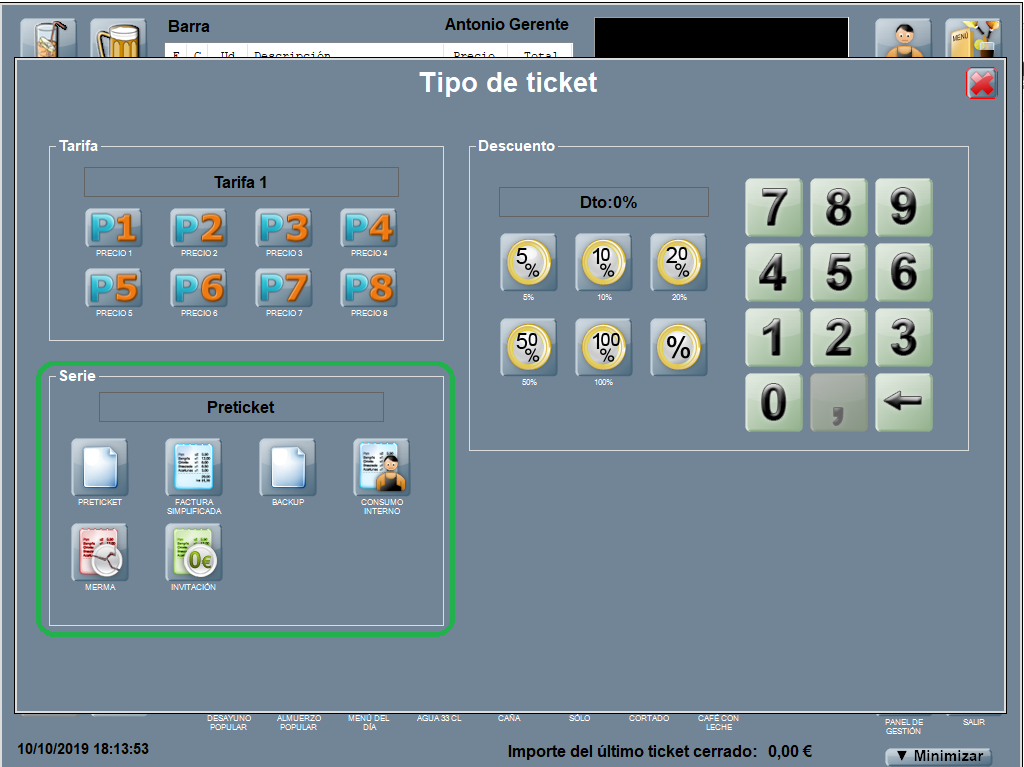 Para cambiar la serie de un ticket, pulsa el botón TIPO DE TICKET.