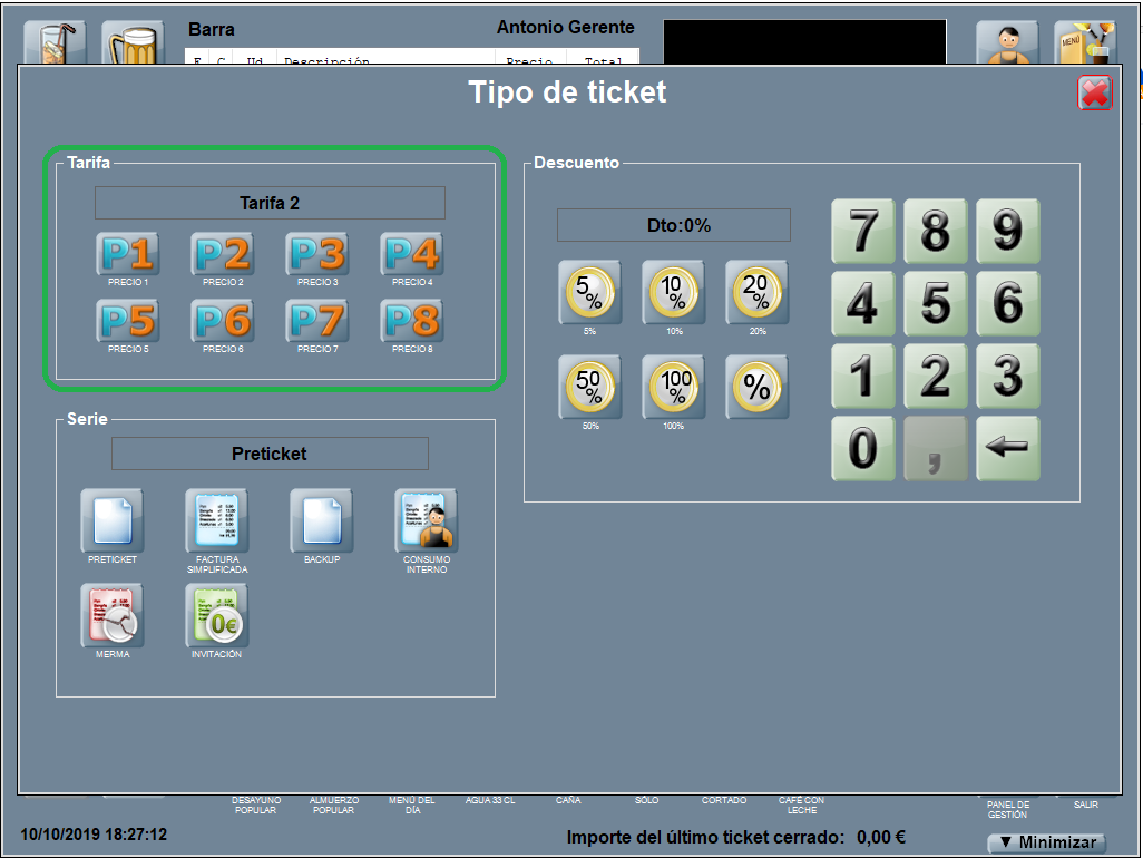 La tarifa es visible en la pantalla principal con letra de color amarillo, que la hace destacar, con lo que en todo momento el usuario sabe qué tarifa está aplicada a la comanda. En el ejemplo, P2 = Precio 2.
