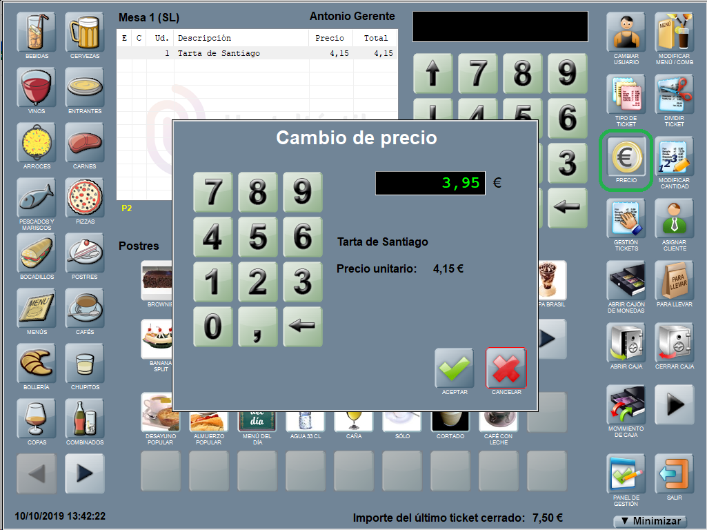 Si el producto ya está añadido a la cuenta, primero selecciónalo y después pulsa PRECIO. Se abre la ventana de cambio de precio, desde la que podrás escribir el nuevo precio en euros y ACEPTAR.