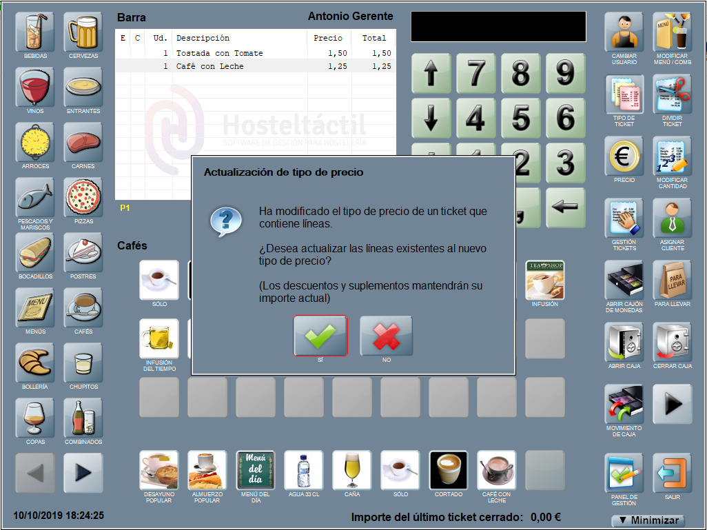 Hosteltáctil® permite diversos niveles de precio al trabajar con ocho tarifas. No obstante también admite, si el usuario dispone de permiso para alterar importes, modificar un precio a petición en el momento de la comanda.