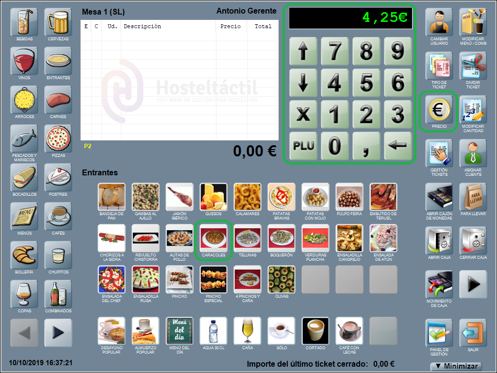 Para poner un precio puntual a un producto, tras escribir el precio con el teclado pulsa el botón PRECIO, se muestra el precio en el visor del teclado (4,25€). Luego pulsa el producto, y éste tomará ese precio.