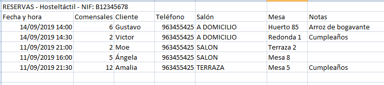Puedes exportar a Excel (CSV) las reservas que se visualizan en el listado, utiliza el EXPORTAR A EXCEL (CSV), para hacer una copia de los datos en pantalla, en un fichero aparte.