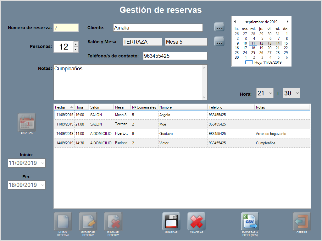 Se evita solapar reservas en una mesa. Al seleccionar una mesa reservada automáticamente se asocia el cliente y el número de comensales de la reserva.