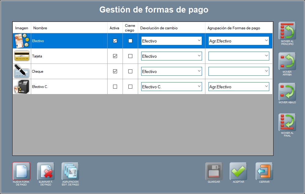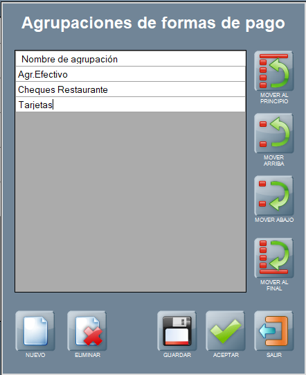 Seguidamente, si quieres, ordena las agrupaciones de formas de pago a tu gusto con los botones del lateral, moviendo las filas a la posición deseada.