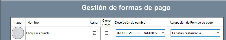 Para rellenar la línea completa los pasos: 1) asocia una imagen pulsando el recuadro imagen; 2) marca la forma de pago cómo activa; 3) selecciónala, si lo deseas, como cierre ciego, para que no aparezca en la pantalla de recuento de caja; 4) indica la forma de pago en la que realizar la devolución de cambio, o directamente, si no lo devuelve; y en la última columna, 5) elige la agrupación a la que pertenece, si procede.