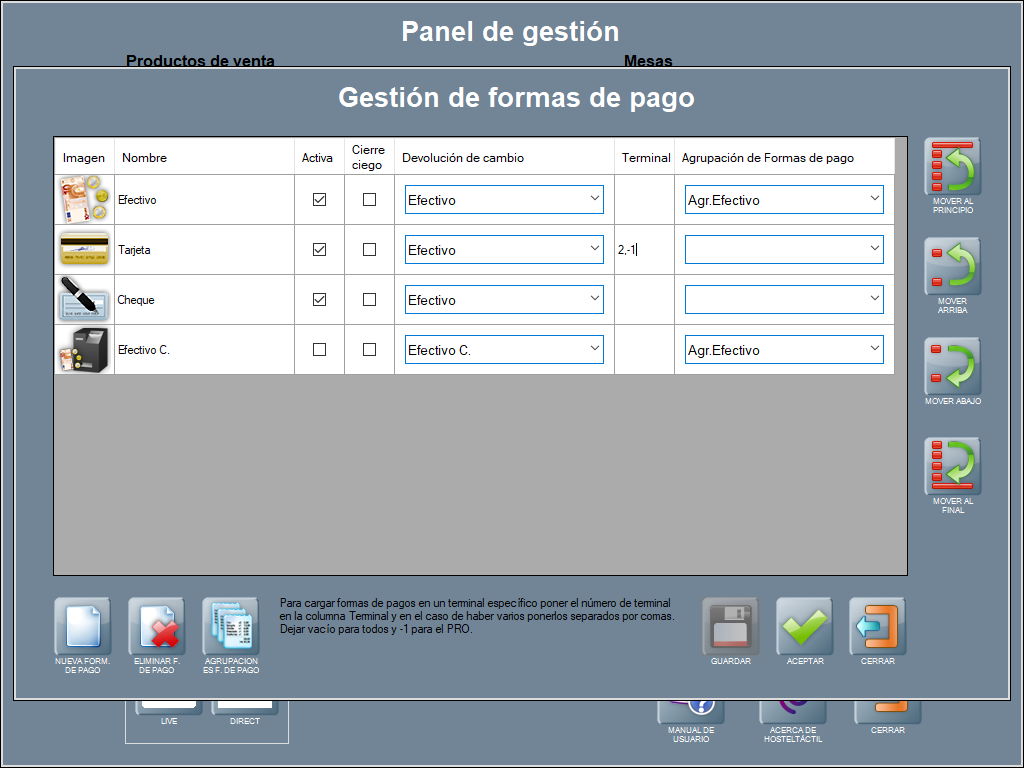 También puedes colocar en las primeras posiciones las formas de pago más usadas (efectivo o tarjeta), con los botones del lateral.