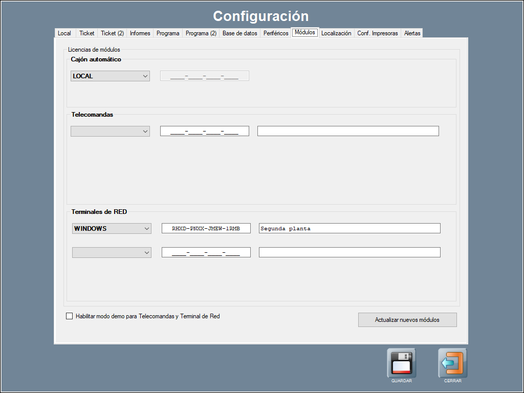 Para licenciar un módulo o terminal, tienes que copiar el código máquina del mismo, e introducirlo en la casilla que corresponda, seleccionando el tipo adecuado (LOCAL, RED, ANDROID, WINDOWS, etcétera).