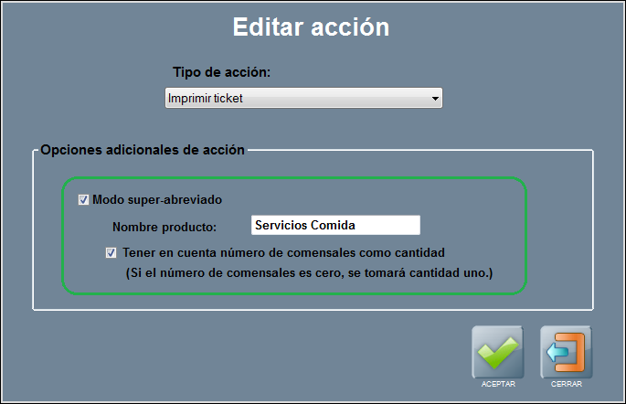 Omitir petición de comensales en mesas con comensales establecido: esta casilla indica que, si la mesa ya tiene un número de comensales asignado, no se ejecute esta acción.