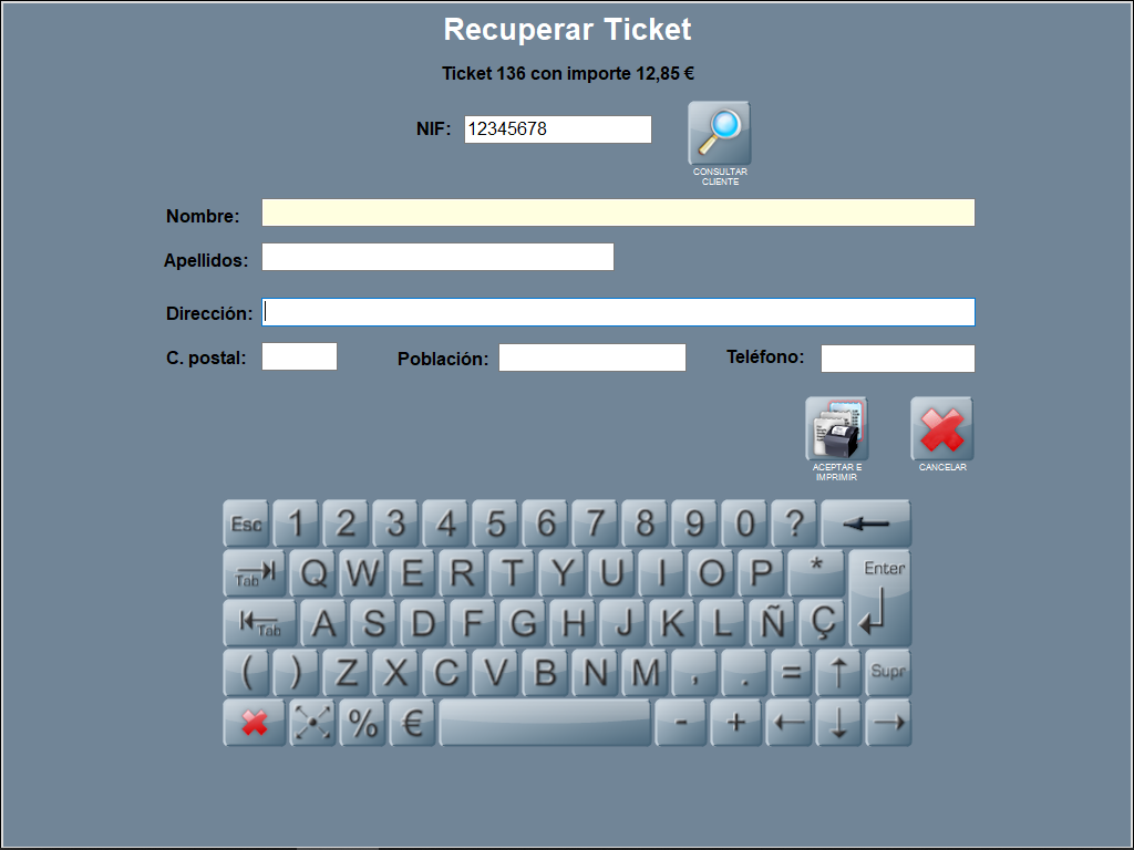 La utilidad de esta función es poder recuperar, de forma rápida, un ticket, y acto seguido asociarlo a un cliente e imprimir el mismo ticket, pero con el encabezado con los datos del cliente.