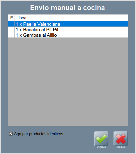 Puedes marcar la casilla situado en la parte inferior de esta pantalla, para agrupar los productos similares en cocina (por ejemplo, si tienes dos paellas iguales, enviar una línea donde se especifique la cantidad y el producto)