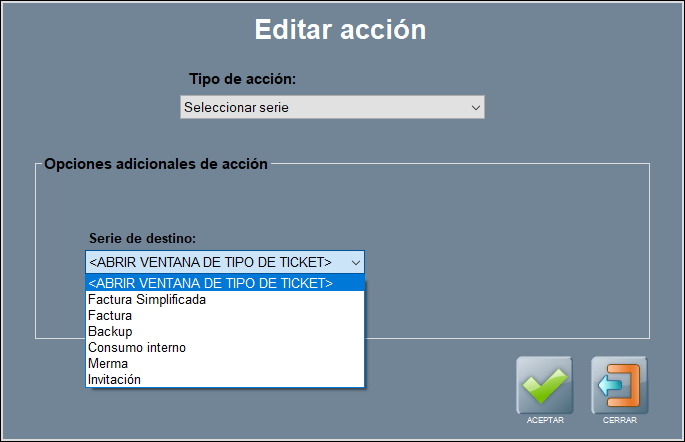 Esta acción cambia la serie del ticket, pudiendo elegir si quieres que se abra la ventana de cambio de tipo o serie de ticket, o seleccionar directamente la serie.