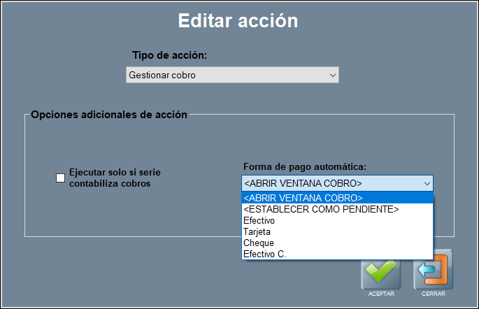 También tiene una casilla para ejecutar la acción solo si la serie contabiliza cobros, es decir, excluiría series como mermas, consumos internos, etcétera.