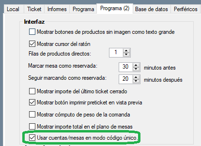 Para usar esta acción, primero necesitas habilitar la opción de Usar mesas/cuentas en código único, en Panel de Gestión / Configuración / Configurar Opciones / Programa (2).