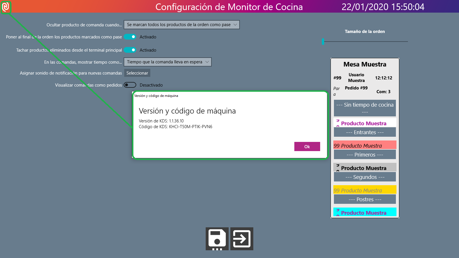 Desde la ventana de Configuración de Monitor de Cocina, a la que se accede desde el icono de la rueda como te explicamos en esta misma página, pulsa sobre el logotipo de Hosteltáctil® situado a la izquierda en la barra de título.