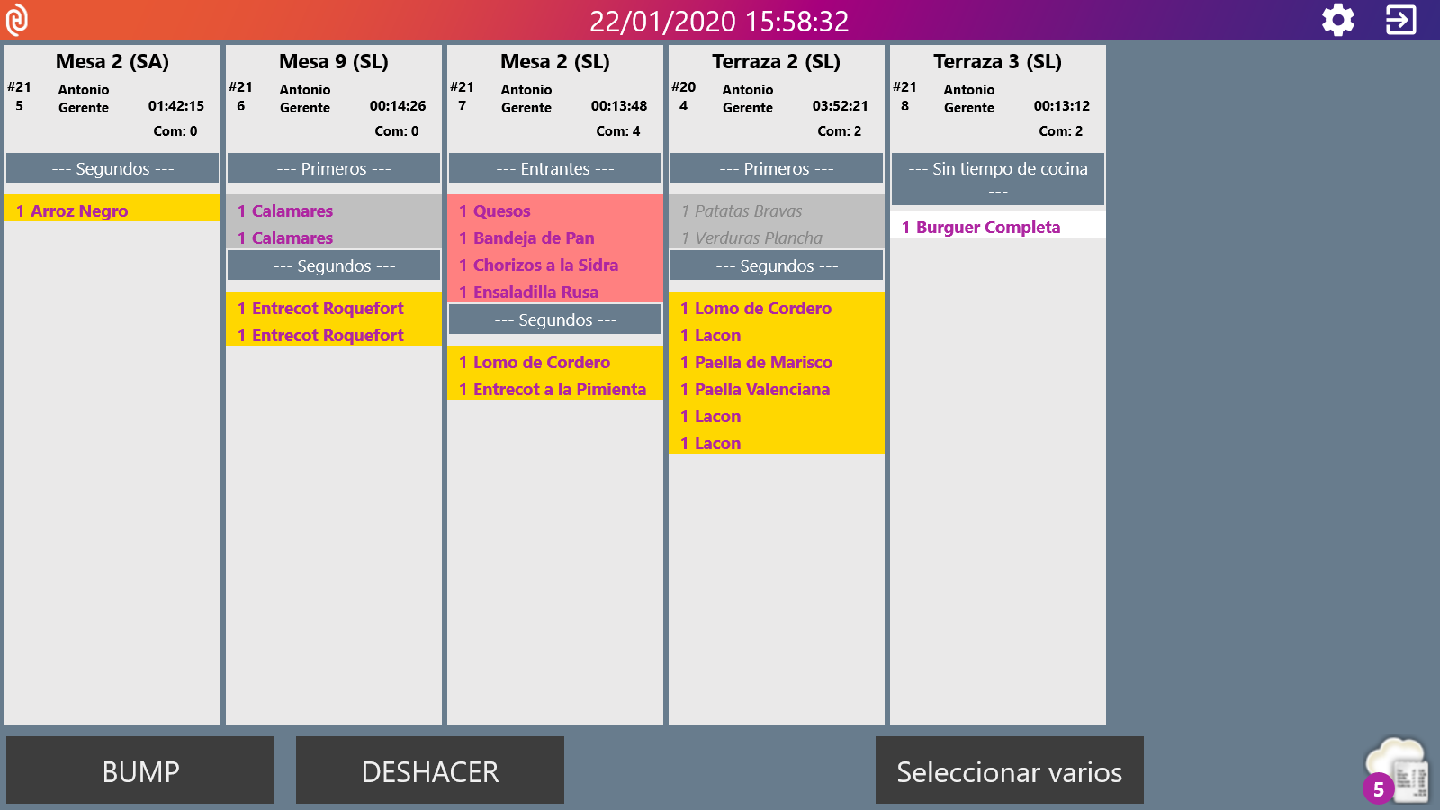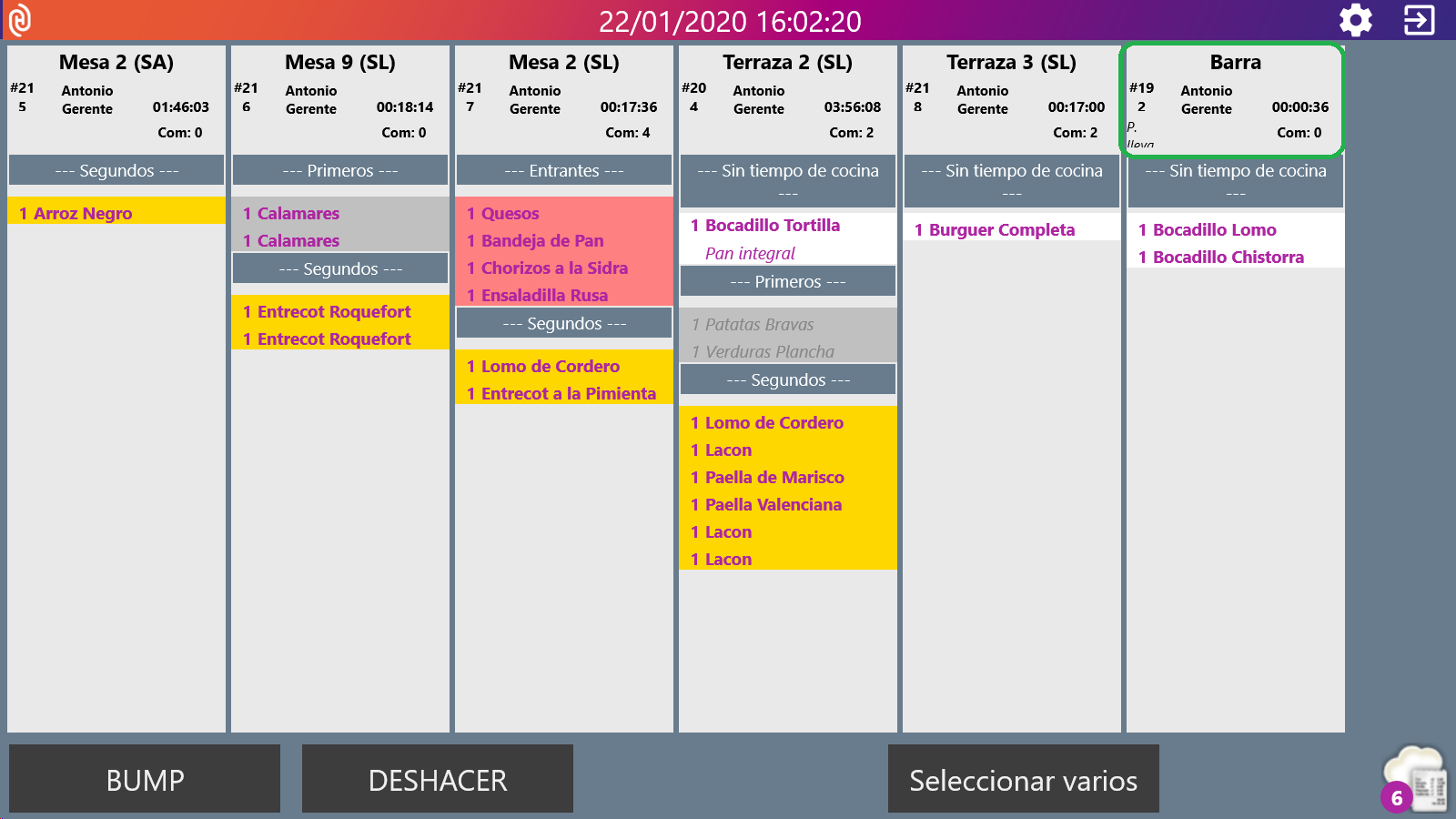 Las órdenes de pedido están a la vista de todo el personal de cocina. En ellas se indican los datos de la mesa, número de comensales y tiempos de espera, así cómo los tiempos de cocina y sus correspondientes fondos de color.
