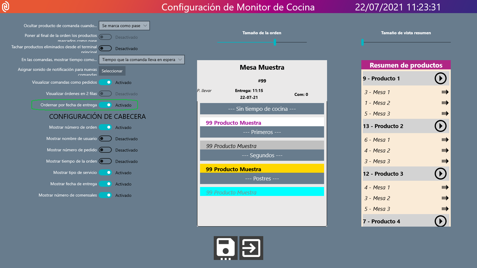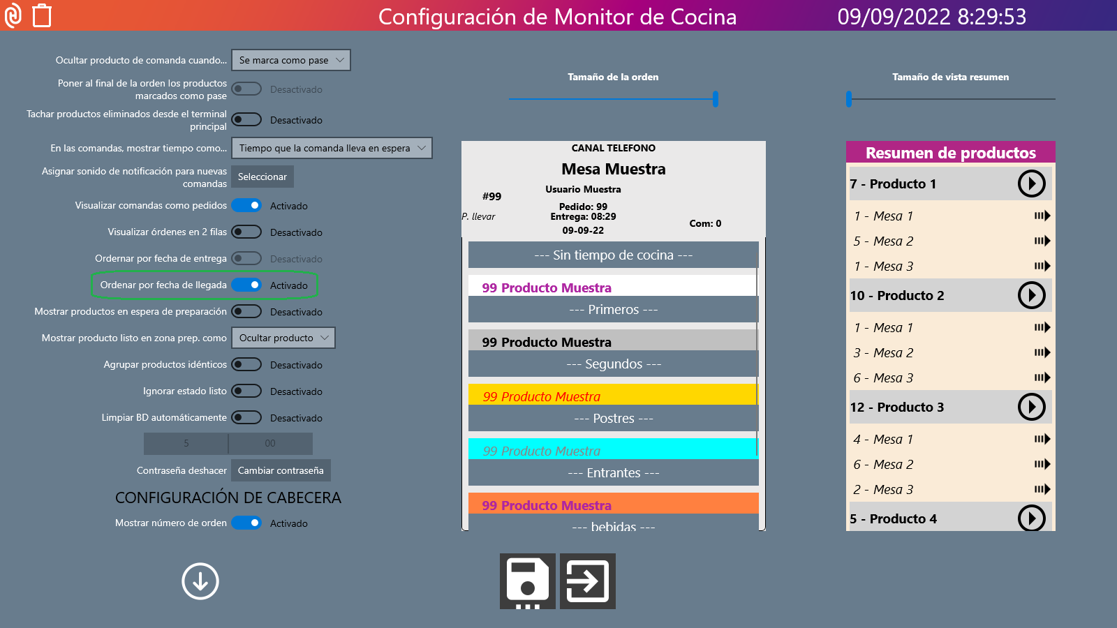 El monitor de cocina permite ordenar las comandas de las mesas por fecha de llegada, para que se organicen en pantalla según llegan. Para ello accede a la configuración y activa Ordenar por fecha de llegada.