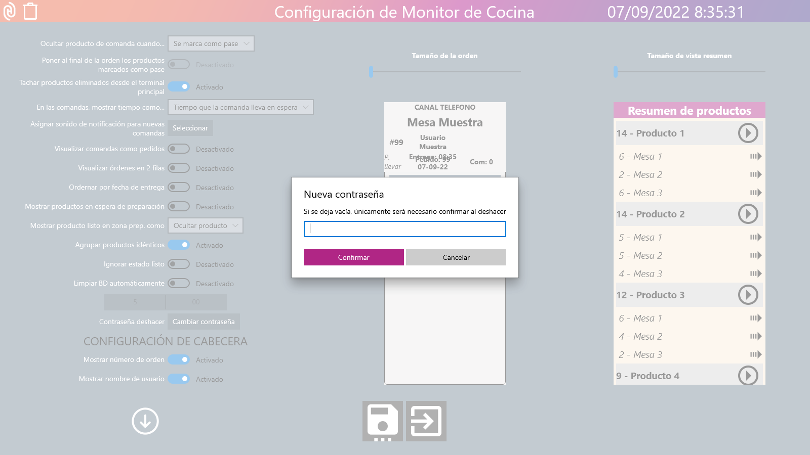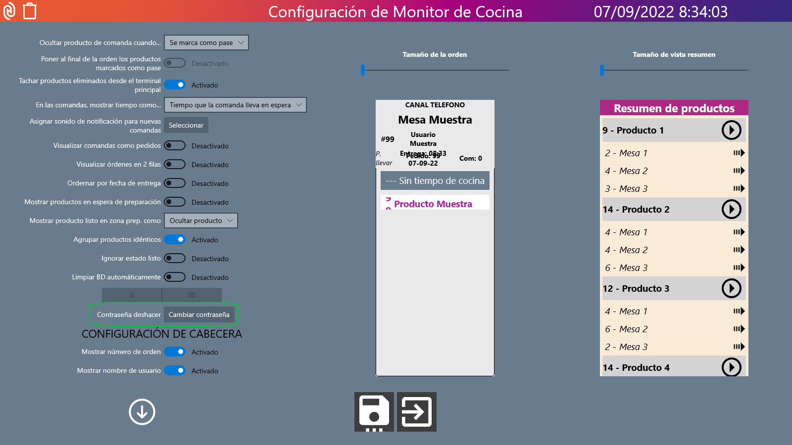 Puedes configurar que el monitor de cocina solicite contraseña al pulsar DESHACER. Para ello, dirígete a la Configuración y usa la opción CAMBIAR CONTRASEÑA para Contraseña deshacer.