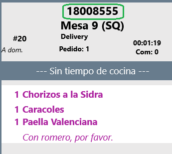 En el ejemplo, fíjate en la Mesa 2 (TZ) 00:01:52 y la mesa Terraza 4 (SL) 00:00:40. Cuando se muestra ‘el tiempo que la comanda lleva en espera’ indica el tiempo correspondiente que falta para empezar a preparar los platos haciendo una cuenta atrás o regresiva. Esto es, te dice el tiempo restante para que el plato se muestre en el estado nueva comanda que hay que preparar, aunque puedes empezar a hacerlo si lo necesitas.
